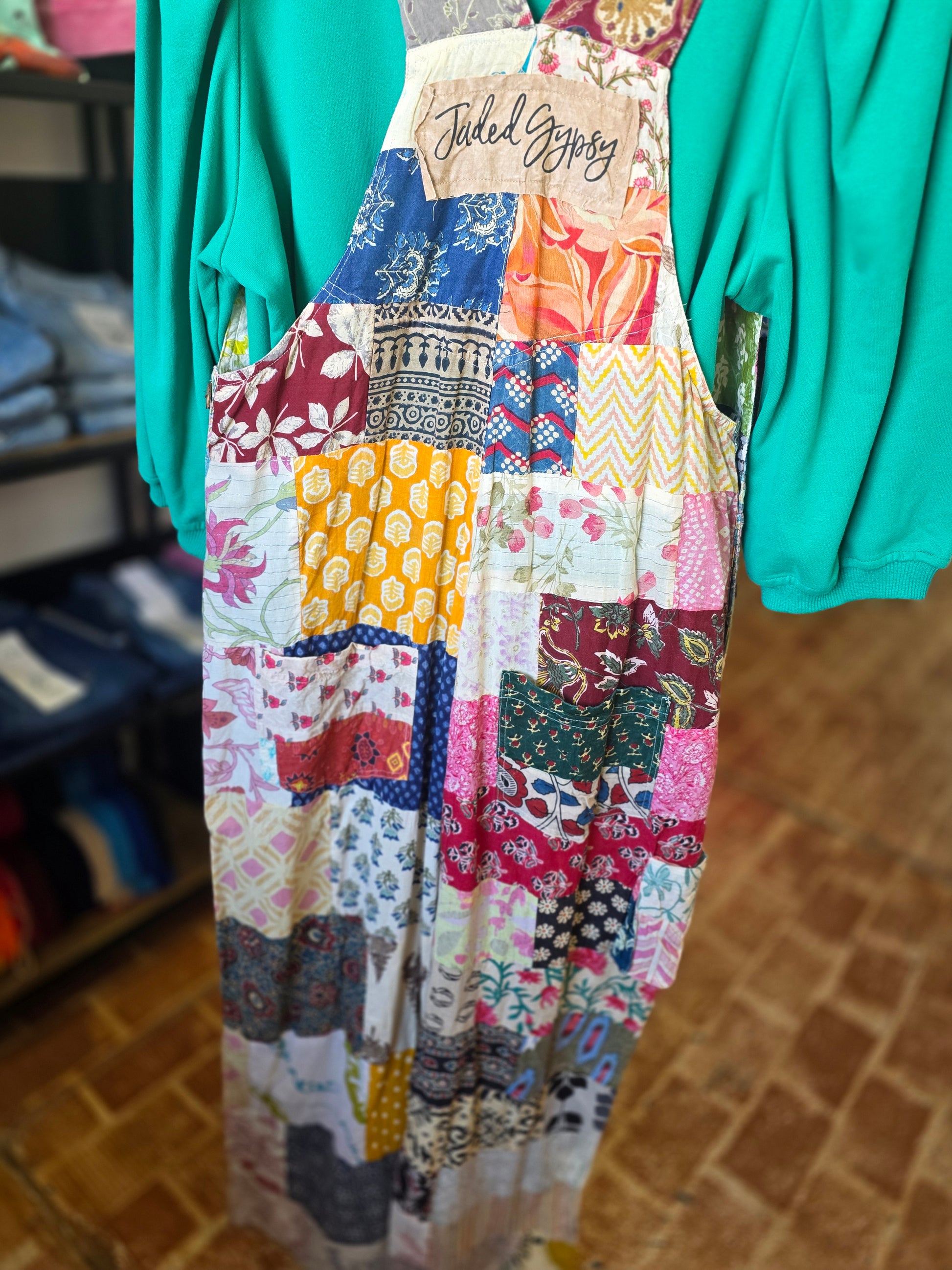 One-of-a-kind Jaded Gypsy patchwork overalls featuring a mix of vintage-inspired prints, soft neutrals, and unexpected pops of color that come together in the best kind of way. Each square is completely unique, giving you that perfectly mismatched, collected-over-time look that Jaded Gypsy is known for.